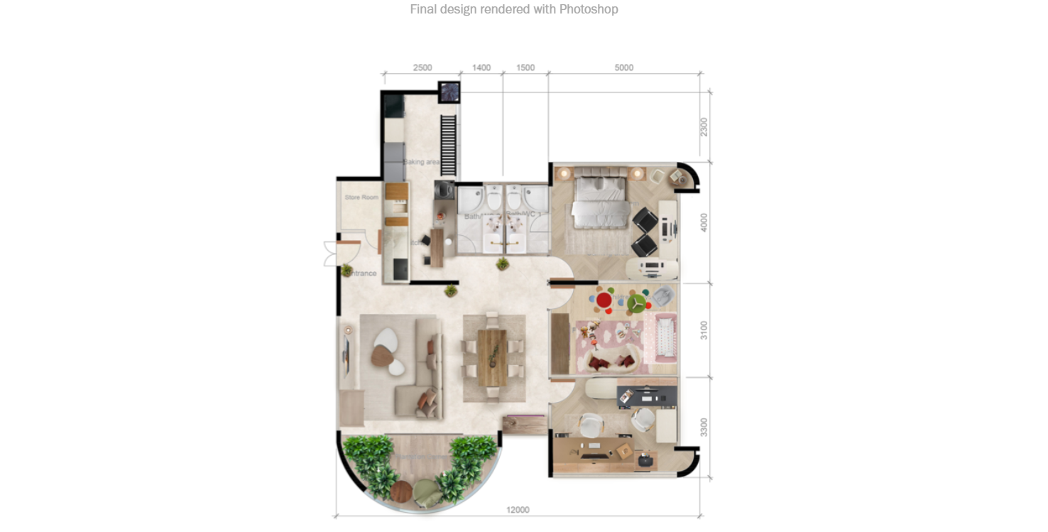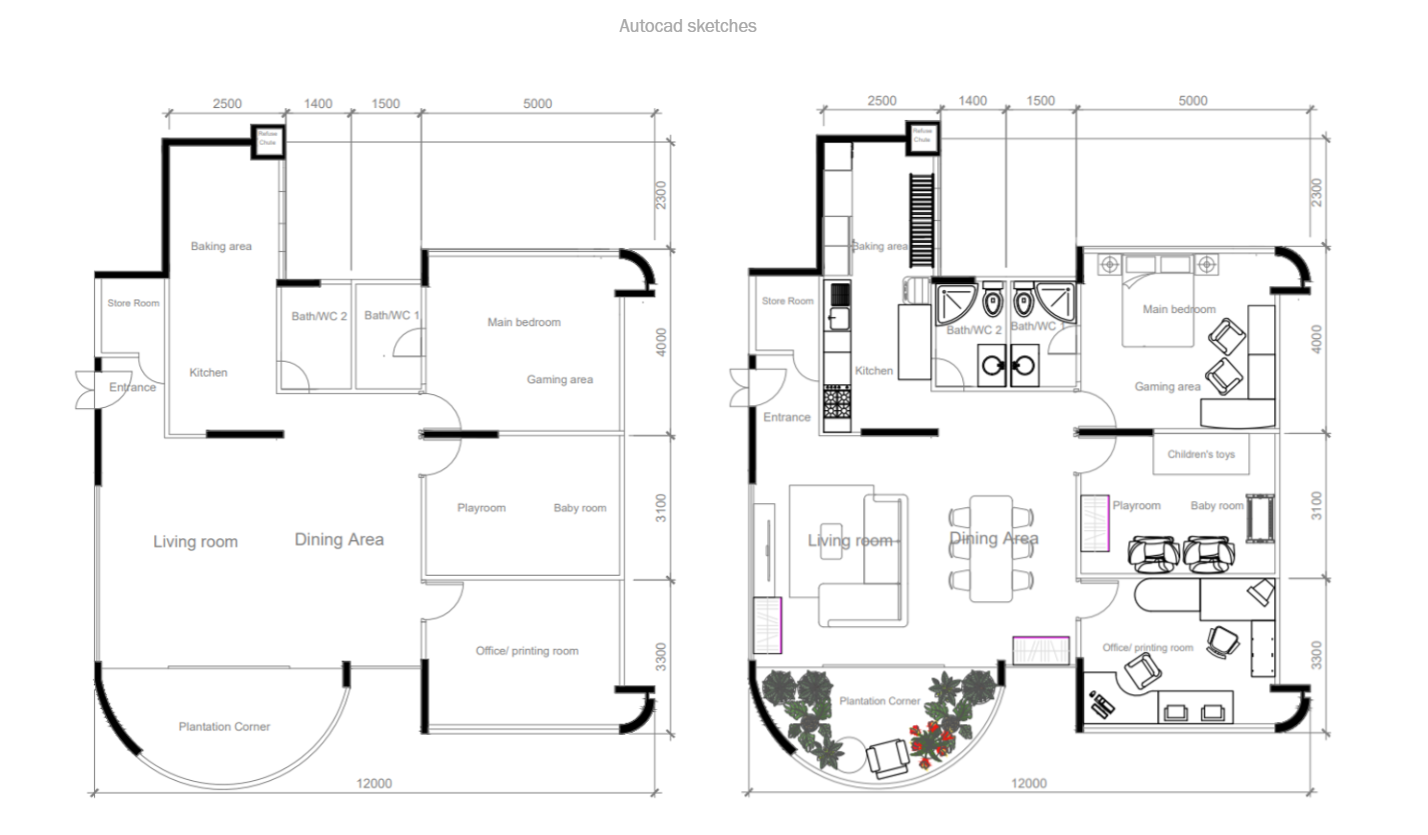 Using softwares like Adobe Photoshop and AutoCAD, i managed to help redesign a residential area. My goal in mind for this project was to make the living area for the family of 4 much more breathable and feel like a home. I made sure there is plenty of space to walk as well as enough room to do the necessary house duties.